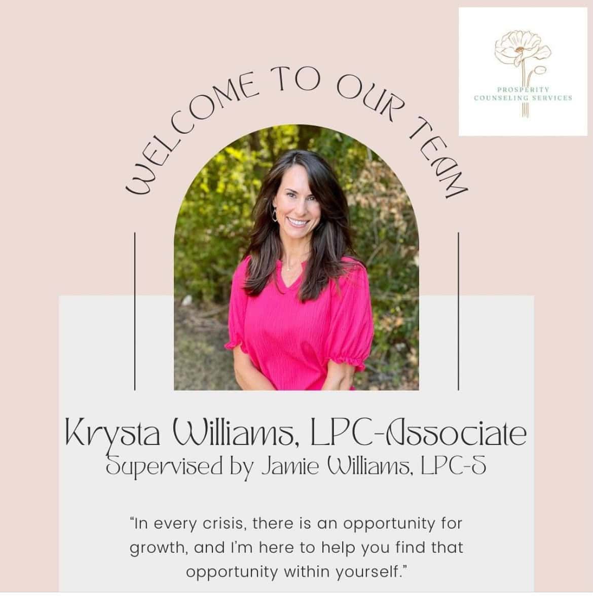 I’m Krysta Williams, LPC Associate. My approach to counseling is centered around warmth, compassion, and building strong therapeutic relationships. I believe in tailoring empirically based methods to meet the unique needs of each individual client, and I enjoy empowering clients to find the capacity for change and growth within themselves.